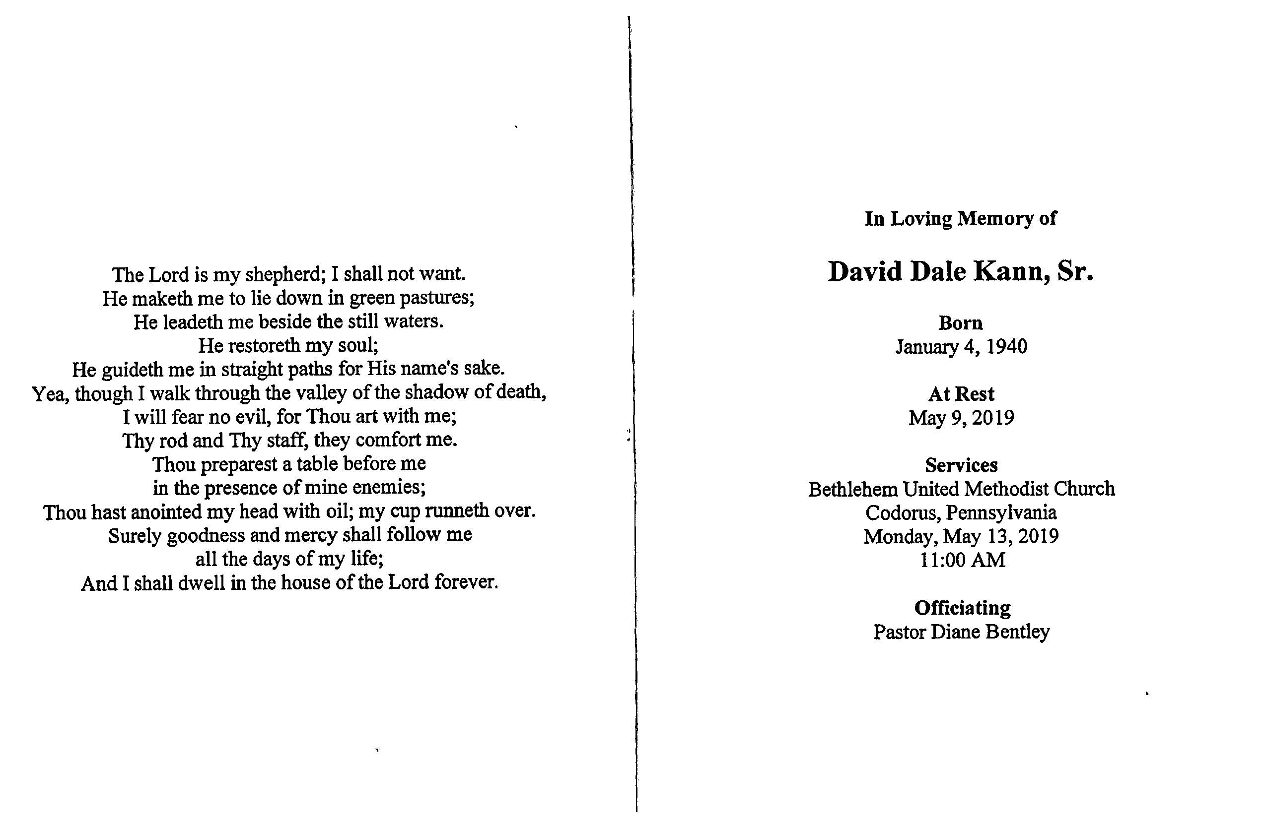 Memorial Card for David Dale Kann Sr.