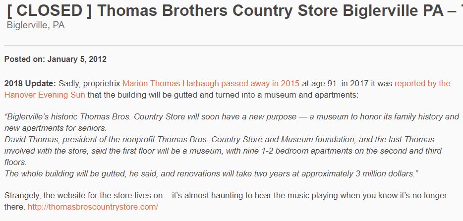 Thomas Bros. Country Store Closes Biglerville’s historic Thomas Bros. Country Store will soon have a new purpose — a museum to honor its family history and new apartments for seniors. David Thomas, president of the nonprofit Thomas Bros. Country Store. |