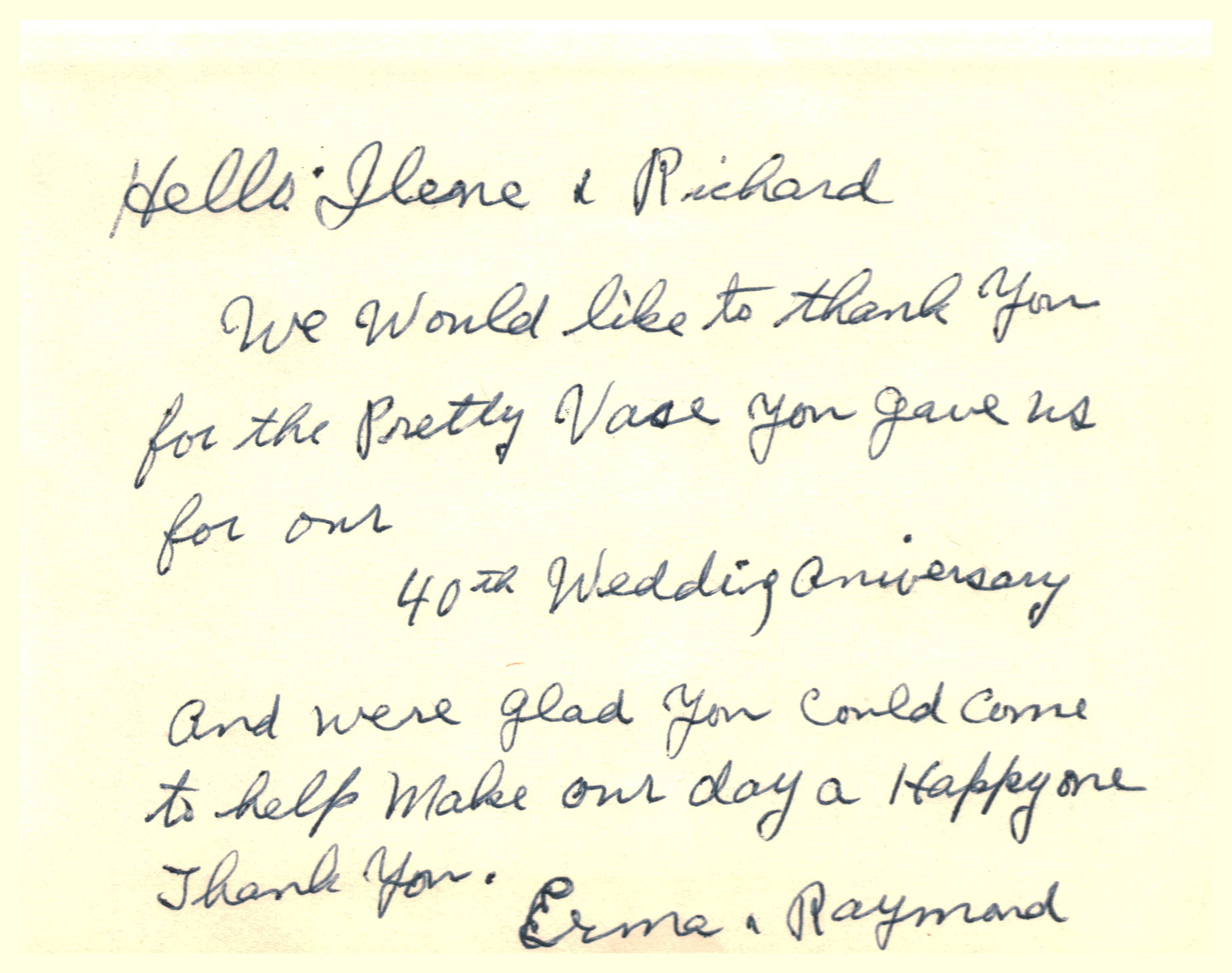 Thank you note Thank you note to brother Richard and wife Ilene for 40th anniversary flower bouquette. |
