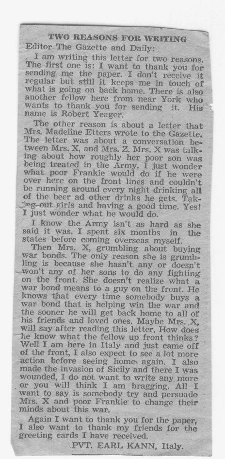 Newpaper Editorial Written by Pvt. Earl Kann while in Italy |