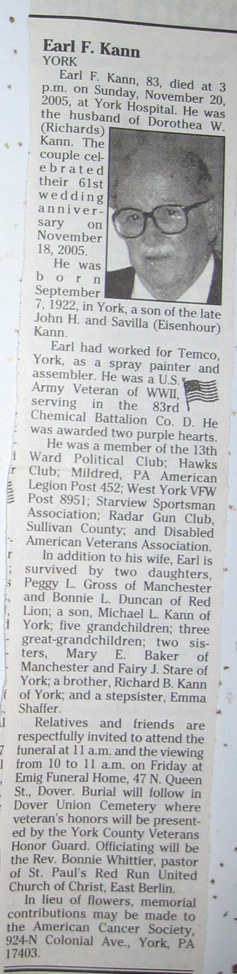 Decendents of Earl F. Kann From Thanksgiving 2007. Mrs. Earl Kann, Bonnie, Peggy, and Mike and their decendants |