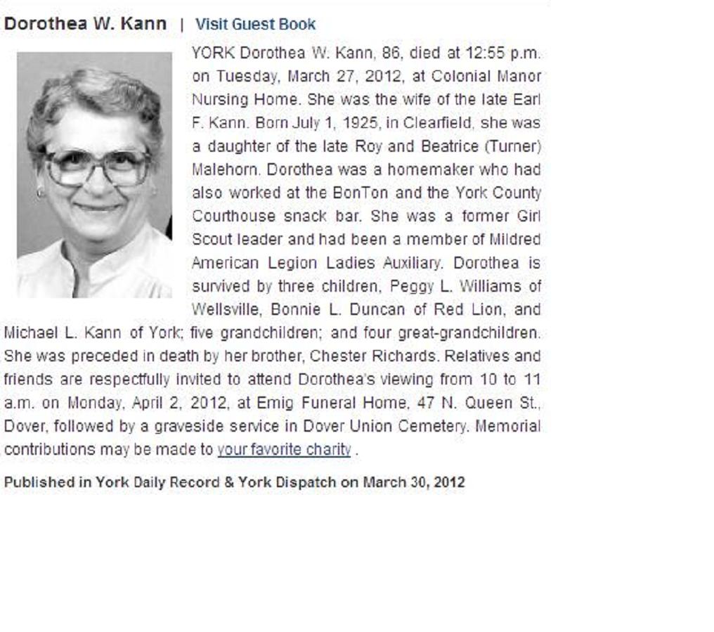 Dorothea W. Kann's Obituary Dorothea passed away on Tuesday March 27, 2012 |