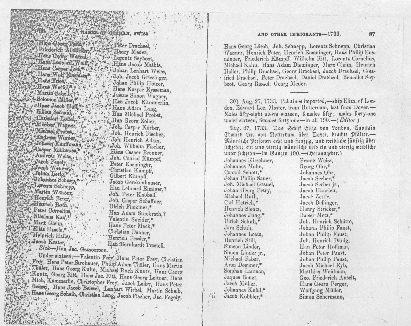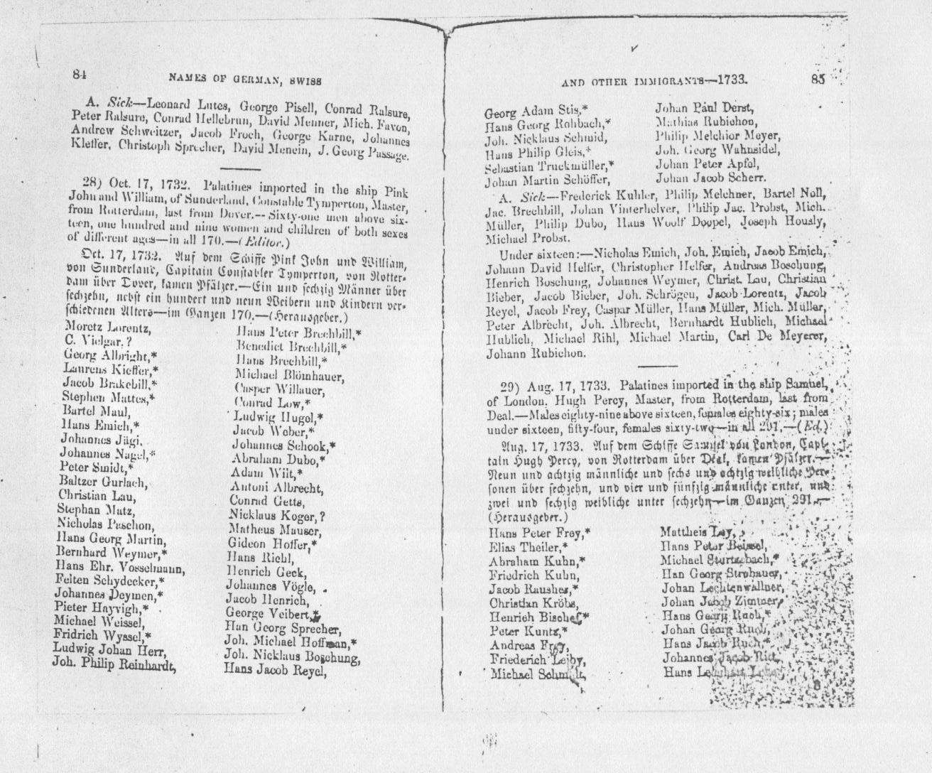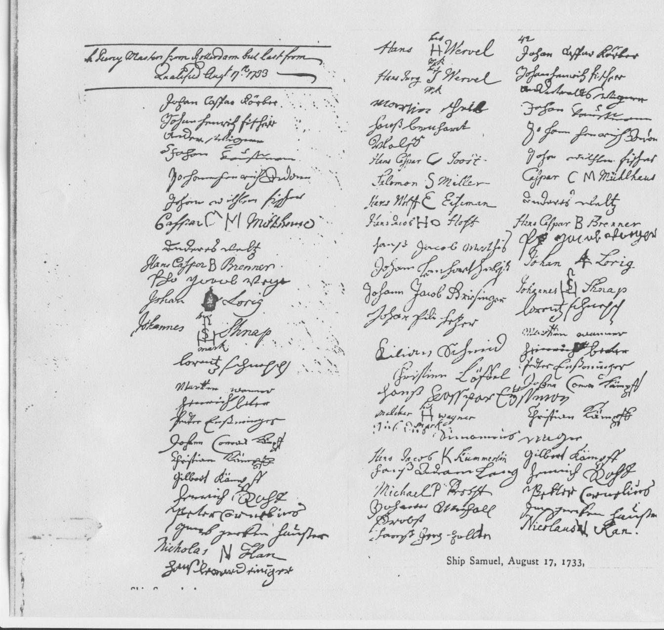 Names of German Immigrants 1733, page 85 August 17, 1733 Palantines imported in the Ship Samuel, Hugh Percy master, from Rotterdam, last from Deal, England. Nicolaus Kan appears as 5 from bottom in left column on page 86. |