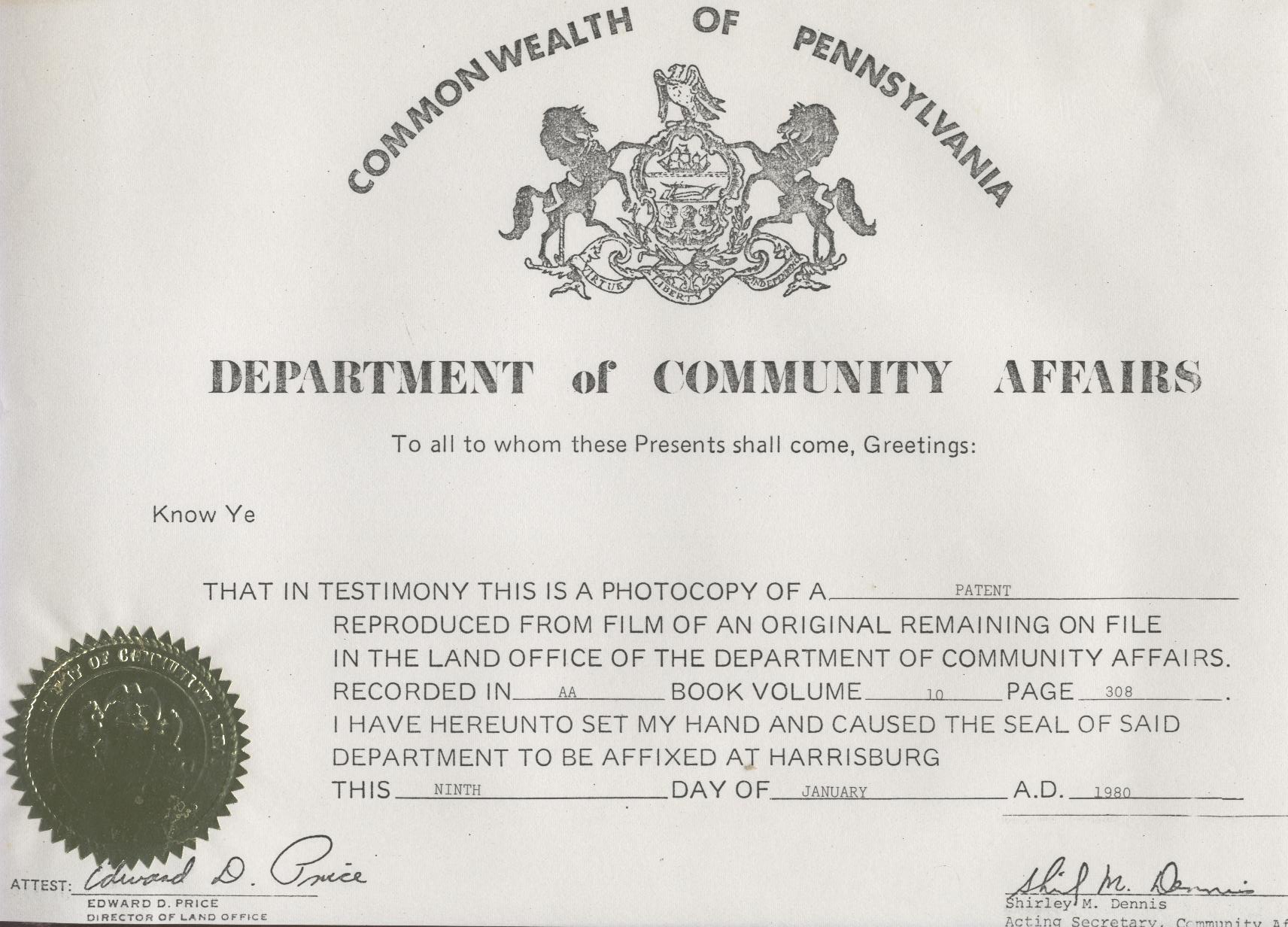 Certificate of Patent Nicholas Kann's Patent on file at the PA Land Office of Community Affairs, Book AA, Volume 10, page 308. |