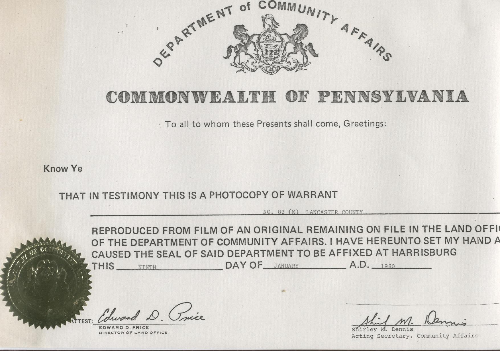 Certificate of Warrant Nicholas Kann's Warrant on file at the PA Land Office of Community Affairs, registers as 83(K) Lancaster County (York was then included) |